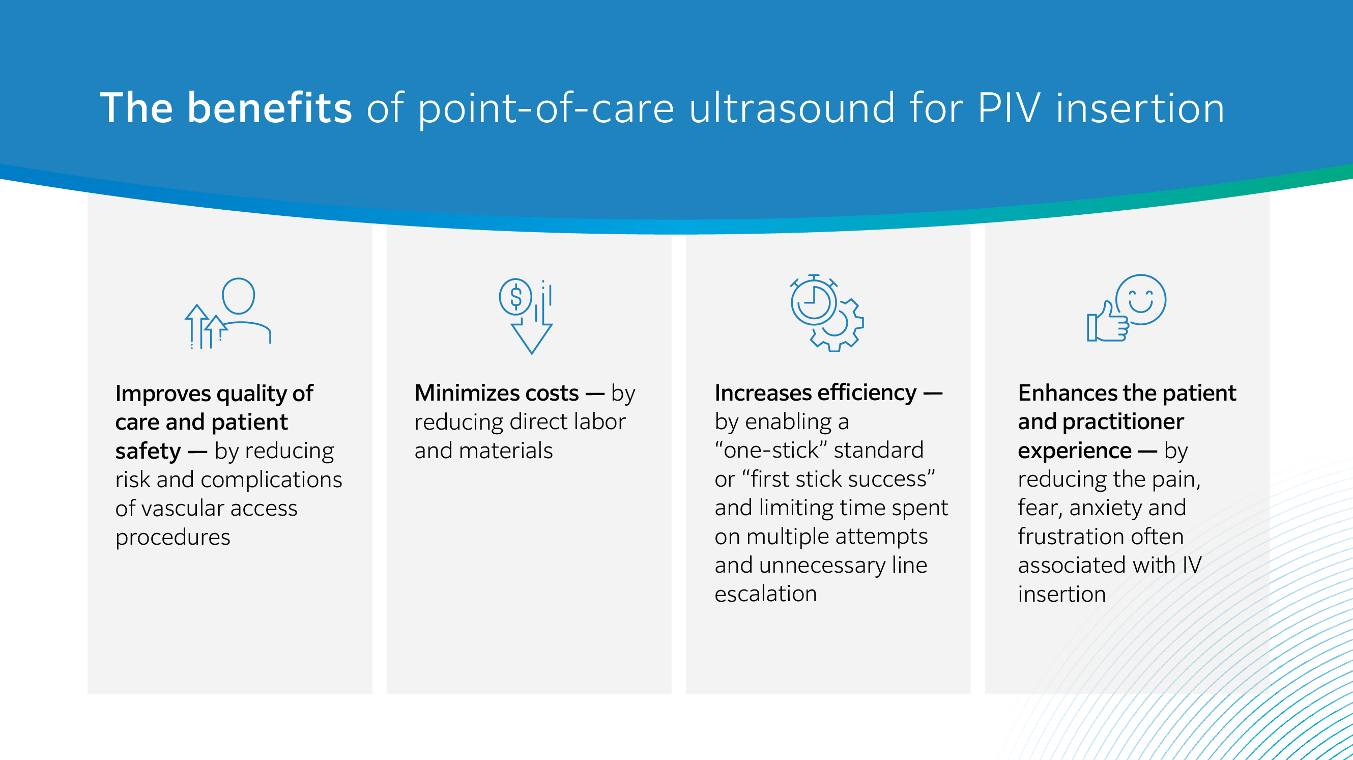 Ultrasound-guided peripheral IV insertion (USGPIV) offers numerous benefits for patients and providers. One healthcare system saw improvement of first-stick success to nearly 100%.1